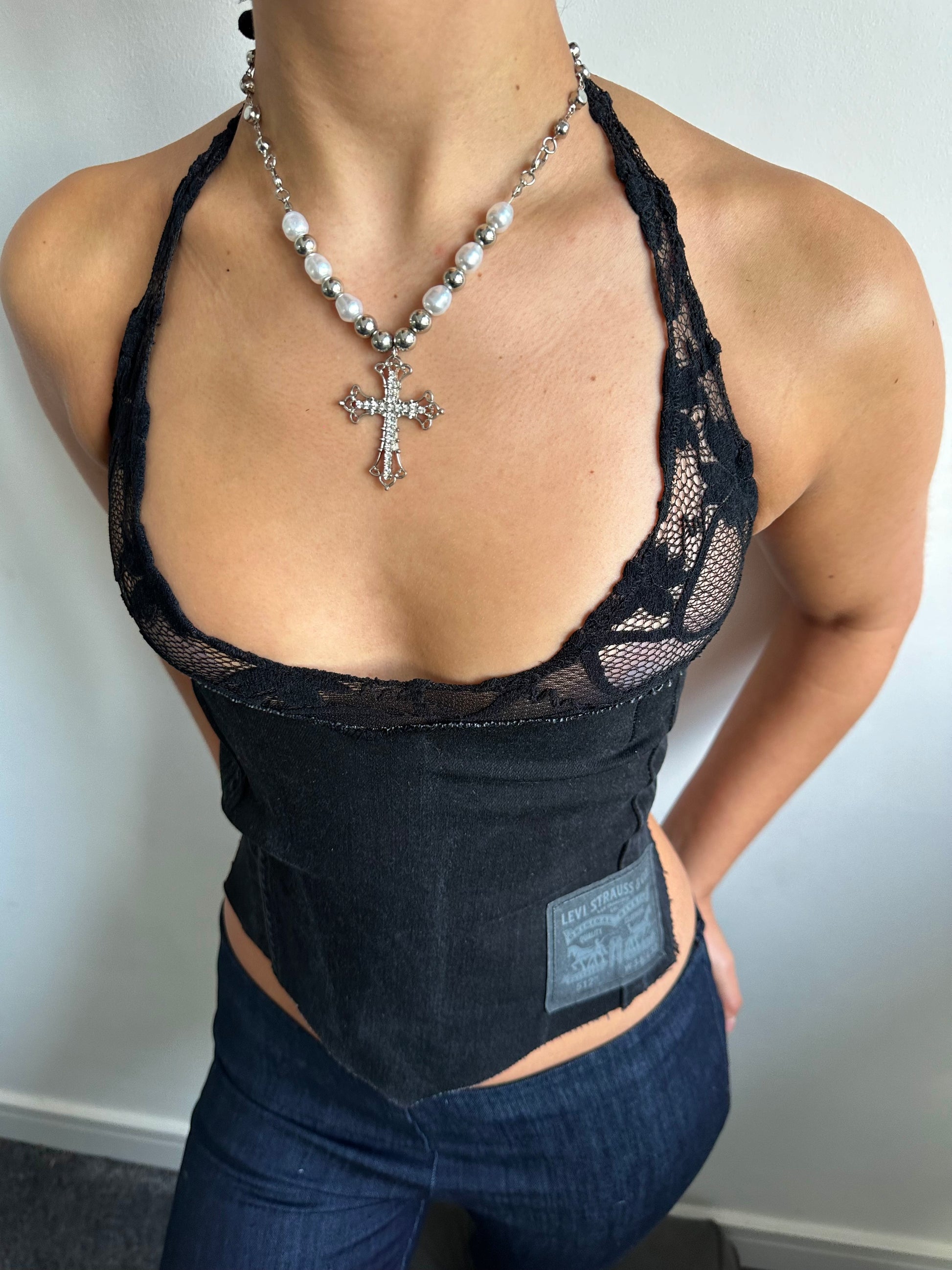 This particular top is one-of-one & ready to ship. This top is crafted from Levi black wash denim jeans & our signature black lace.