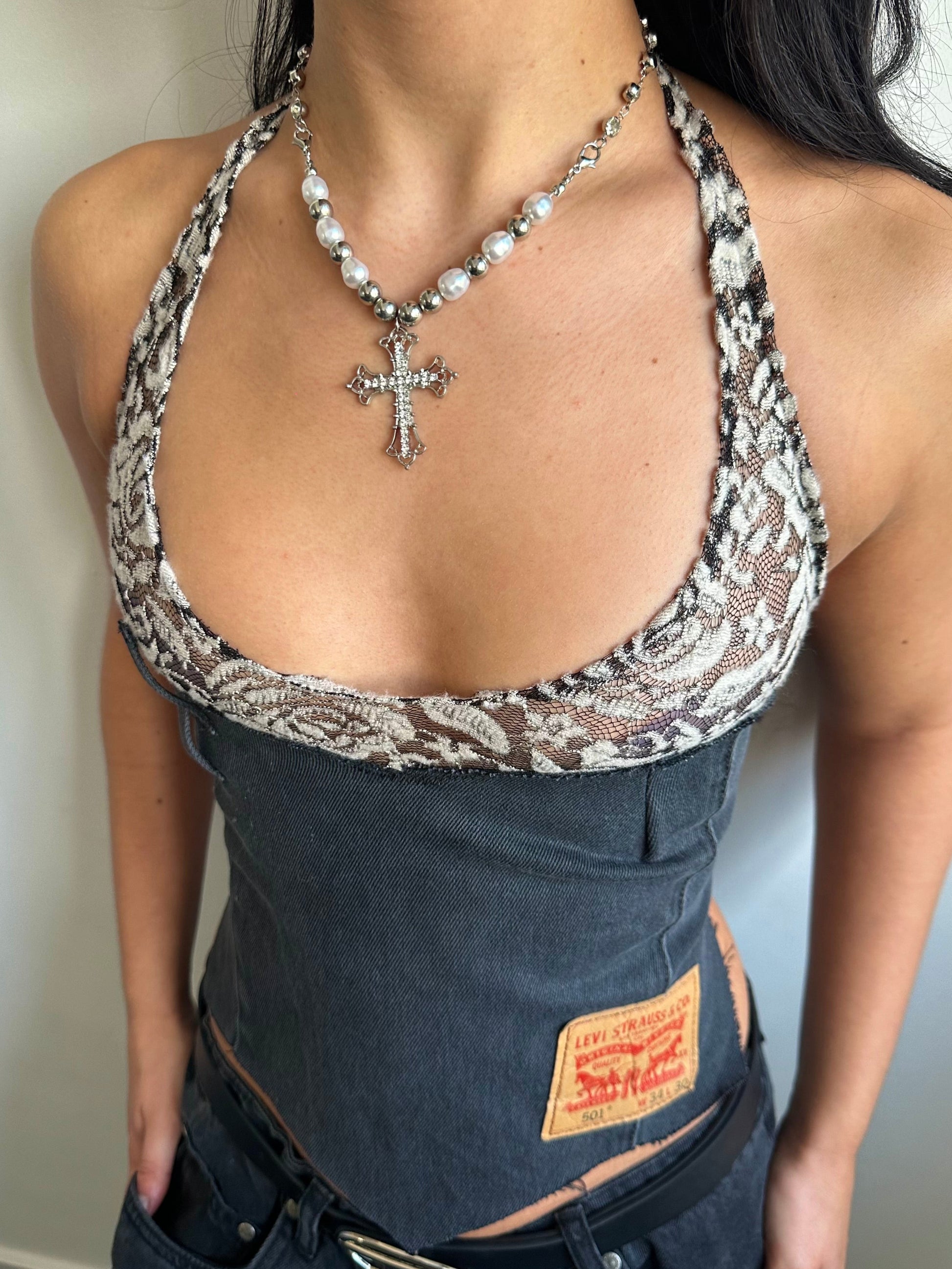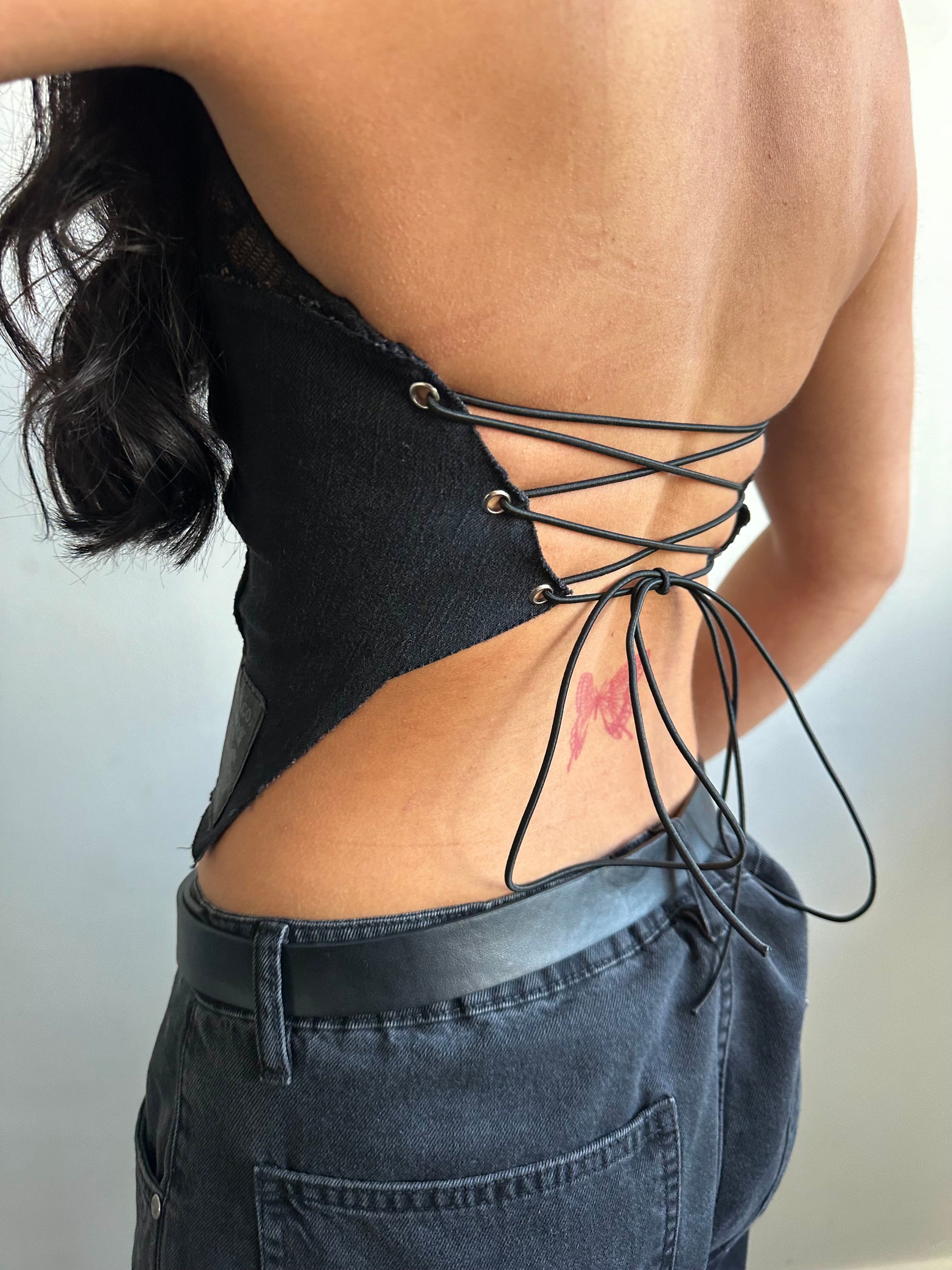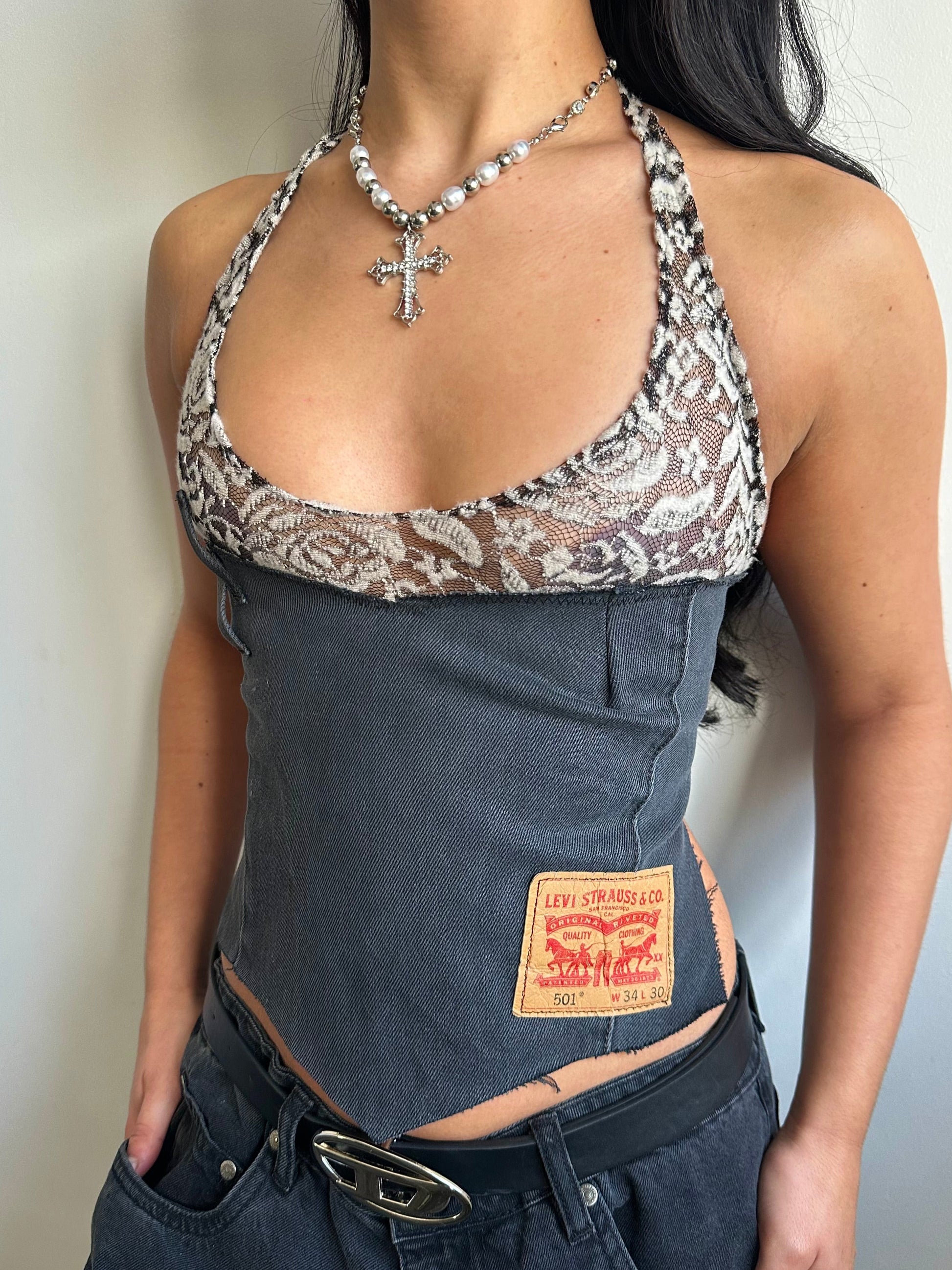 This particular top is one-of-one & ready to ship. This top is crafted from Levi black wash denim jeans & our signature cream lace.
