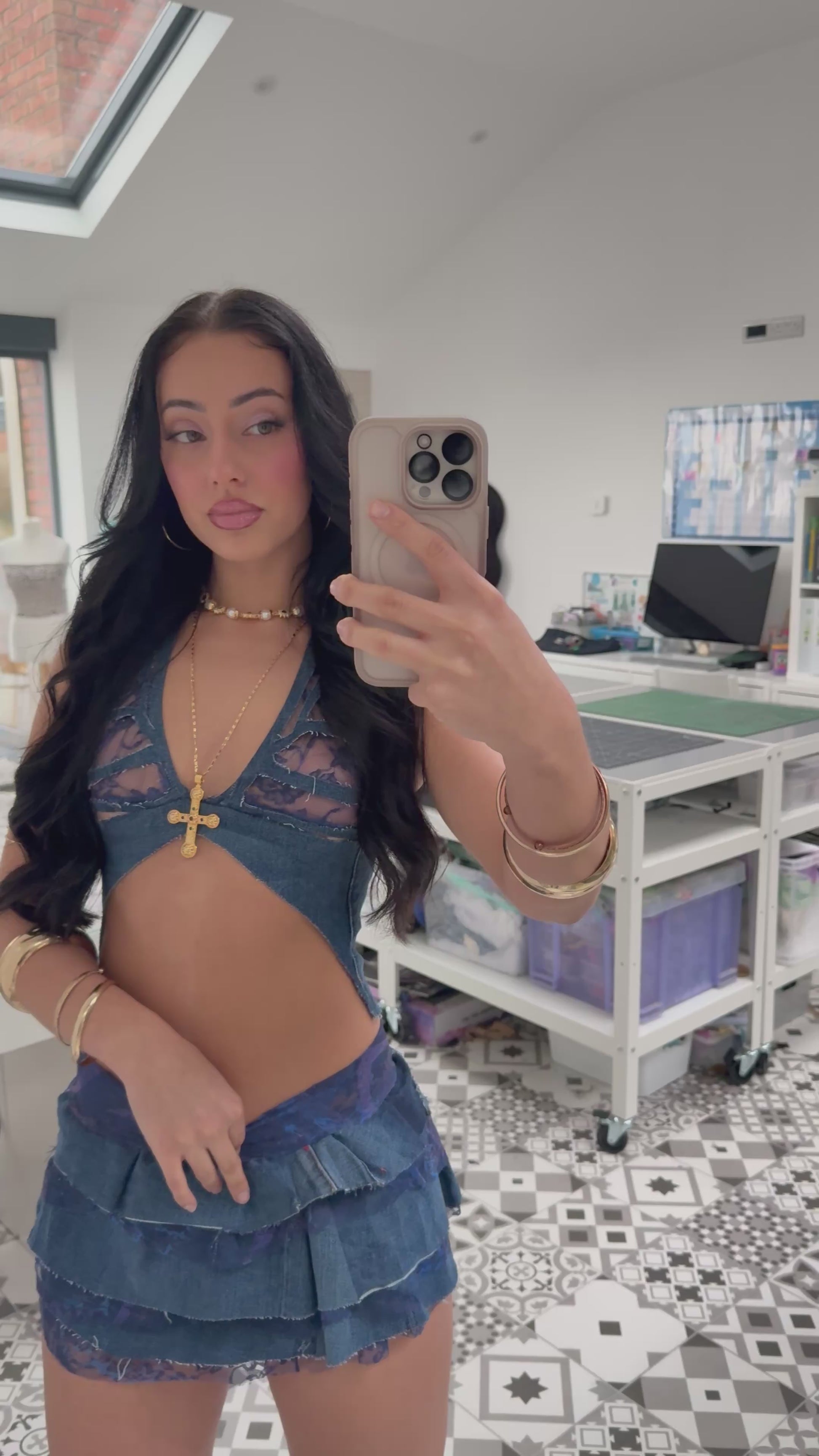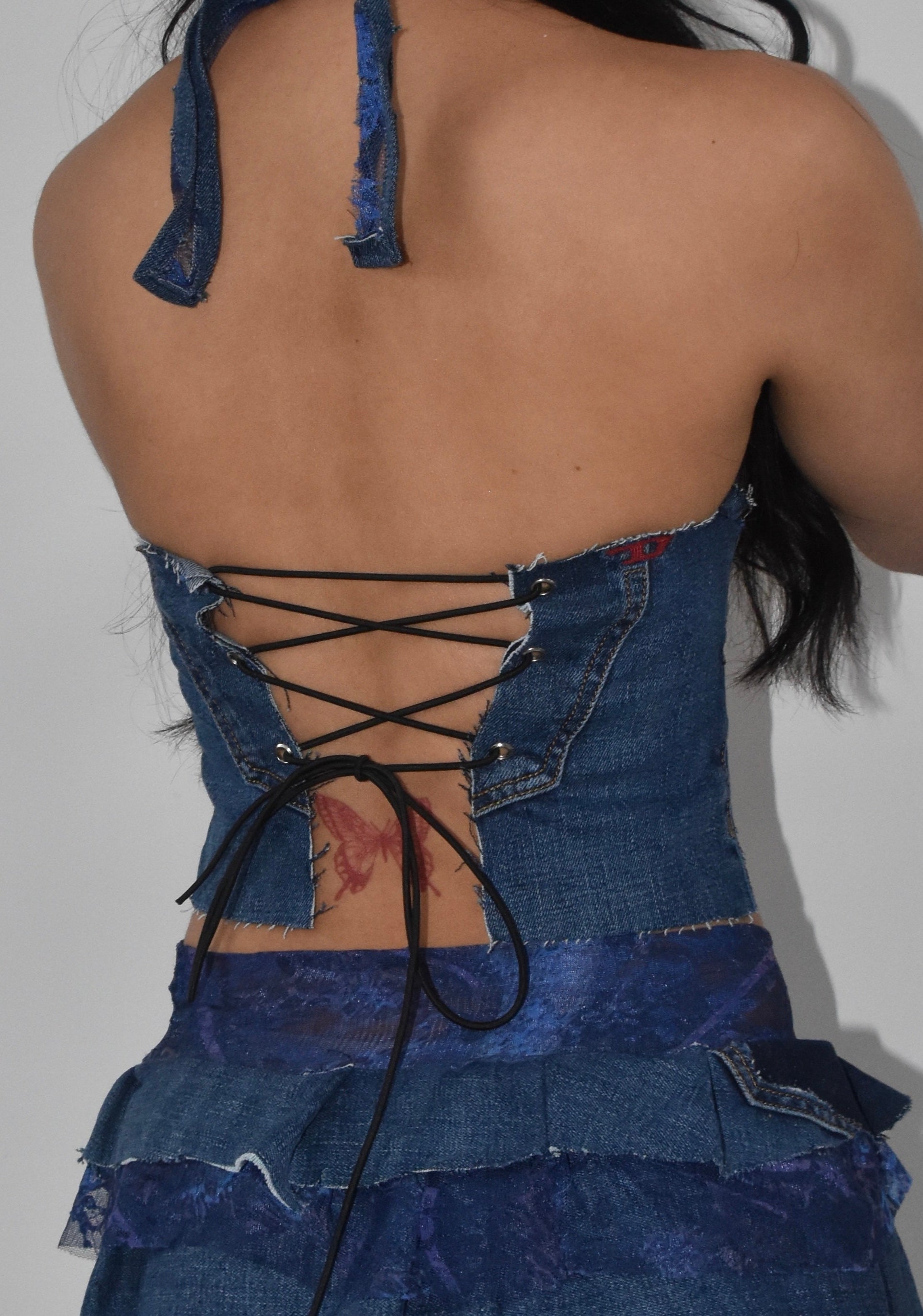 This particular outfit is a one off design crafted from a selection of mid-blue wash denim jeans & our signature blue lace.